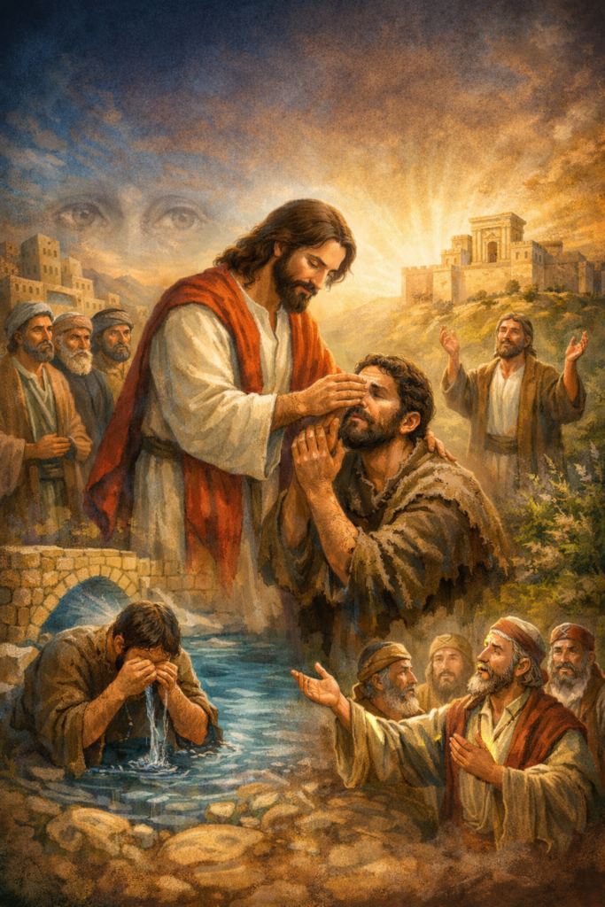Jezus przywraca wzrok niewidomemu od urodzenia. Jest to znak, że Jezus jest światłością świata i doprowadza nas do pełni światłości, czyli poznania prawdy o nas. Kościół rozpoznaje siebie w niewidomym i zostaje oświecony prawdą Syna Bożego. W człowieku toczy się nieustanne zmaganie. Z jednej strony, jak ten niewidomy przez wiarę, zostaję oświecony łaską Chrystusa do poznawania prawd Bożych, a drugiej strony, jak faryzeusze, ma „swoją prawdę” i pozostaje w ciemności. To światło prawdy do Jezus, który przychodzi, by wyrwać nas z ciemności do przyjęcia Syna Człowieczego, który jest źródłem naszego zbawienia. Obraz przywrócenia wzroku niewidomemu jest nie tylko zwyczajnym uzdrowieniem, ale przywróceniem wzroku wiary i oświeceniem łaską Chrystusa. To Jezus jest Światłością świata. Tylko On może nas oświecić łaską prawdy.
